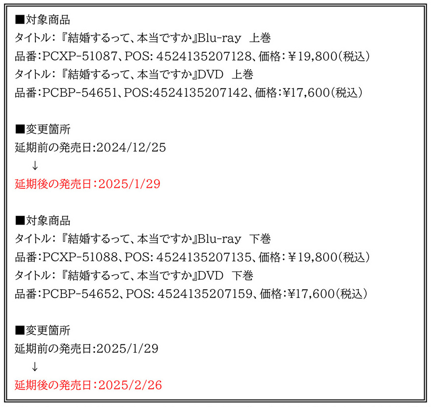2024.12.05 NEWS TVアニメ「結婚するって、本当ですか」Blu-ray&DVD発売日変更のお知らせ TVアニメ「結婚するって、本当ですか」Blu-ray&DVDにつきまして、 制作上の都合により発売を延期させていただくこととなりました。 何卒ご理解いただけますよう、お願い申し上げます。