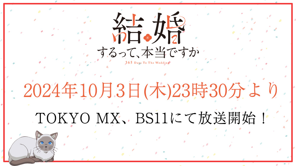 2024.08.16 NEWS TVアニメ「結婚するって、本当ですか」2024年10月3日(木)23時30分よりTOKYO MX、BS11にて放送開始! TVアニメ「結婚するって本当ですか」放送情報続報! 2024年10月3日(木)23時30分よりTOKYO MX、BS11にて放送開始となります!ぜひご覧ください!